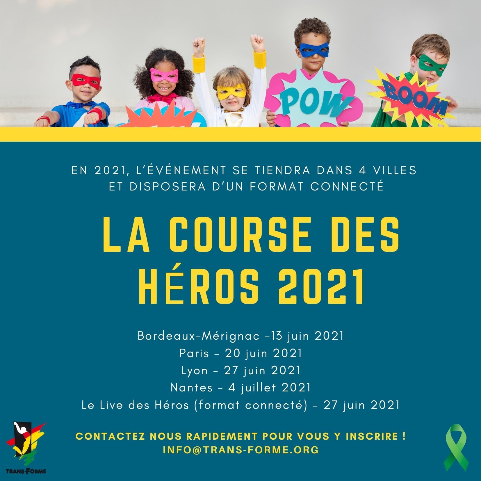 Le principe est simple : Chaque Héros, pour pouvoir courir, marcher … ou voler sur une distance de 2, 6 ou 10 km, doit relever le défi de collecter auprès de son entourage ou/et entreprise (amis, famille, collègue, ...) un minimum de 250 € de dons pour l'association qu'il/elle a choisi de soutenir : Trans-Forme bien sûr 😊